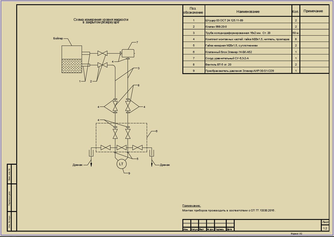 Особенность схемы для котла — учёт плотности пара и воды при рабочих температурах. Датчик монтируется так, чтобы: